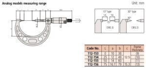 | Code No. | Range (mm) | Graduation (mm) | Maximum permissible error JMPE (μm) | Point |