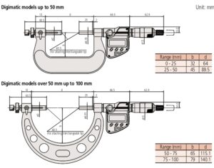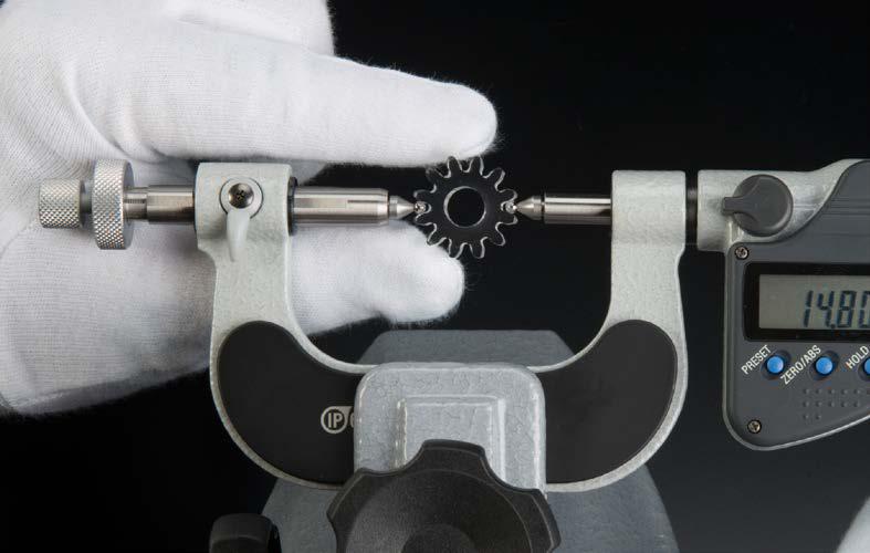 • This specialized micrometer series measures gear over-pin diameters. Attach optional ball for various gear modules (0.5 to 5.25) are probes to each measuring face betore use.