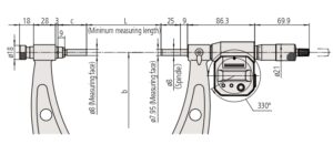 | Code No. | Range (mm) | Resolution (mm) | Spindle feed error (μm) | Flatness (μm) | Parallelism (μm) | Interchangeable anvils | Settting Standard | Micrometer head stroke (mm) | |