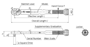 | S.I. Model | Torque Range [N.m] | Metric Model | Torque Range [kgf.cm/kgf.m] | American Model | Torque Range [Ibf.in] | Overall Length [mm] | Square Drive [mm] | Weight [kg] | |||